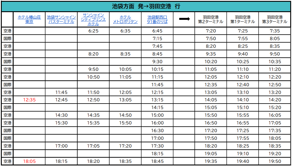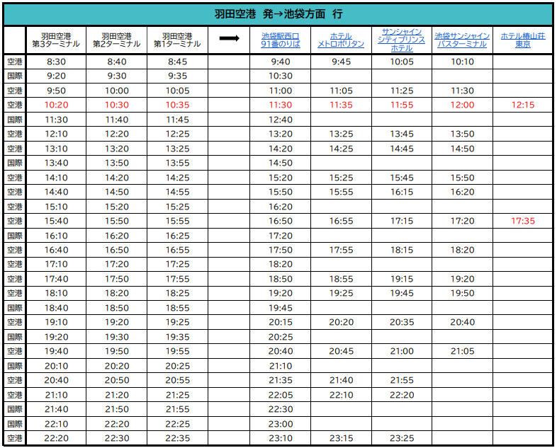 [空港連絡バス]池袋地区-羽田空港 時刻表