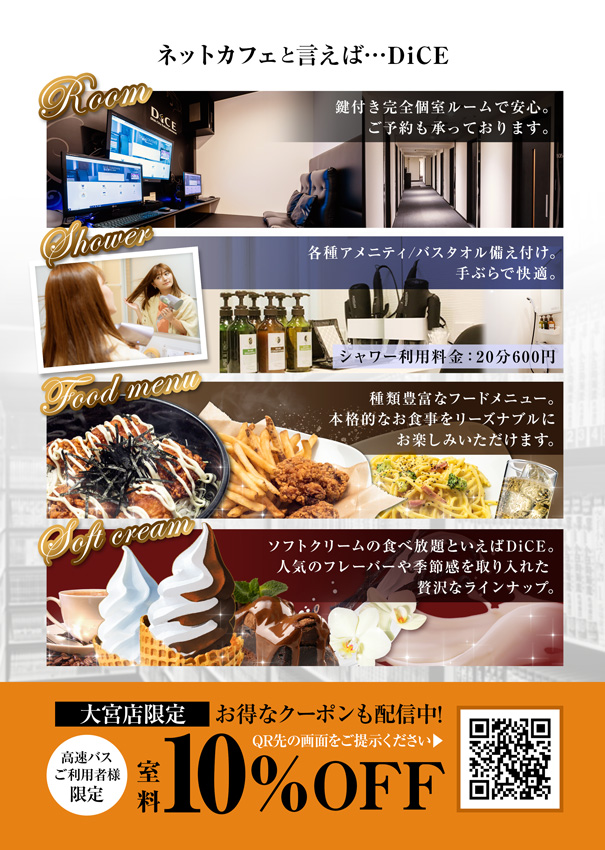 【夜行高速バス利用者限定】 インターネットカフェ『DiCE』をおトクに!
