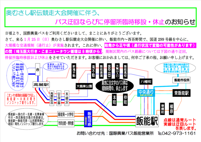 …飯能駅北口~【臨時】飯能河原間で迂回運行します。(飯能駅北口~(臨時)飯能河原間はノンストップ運行)
