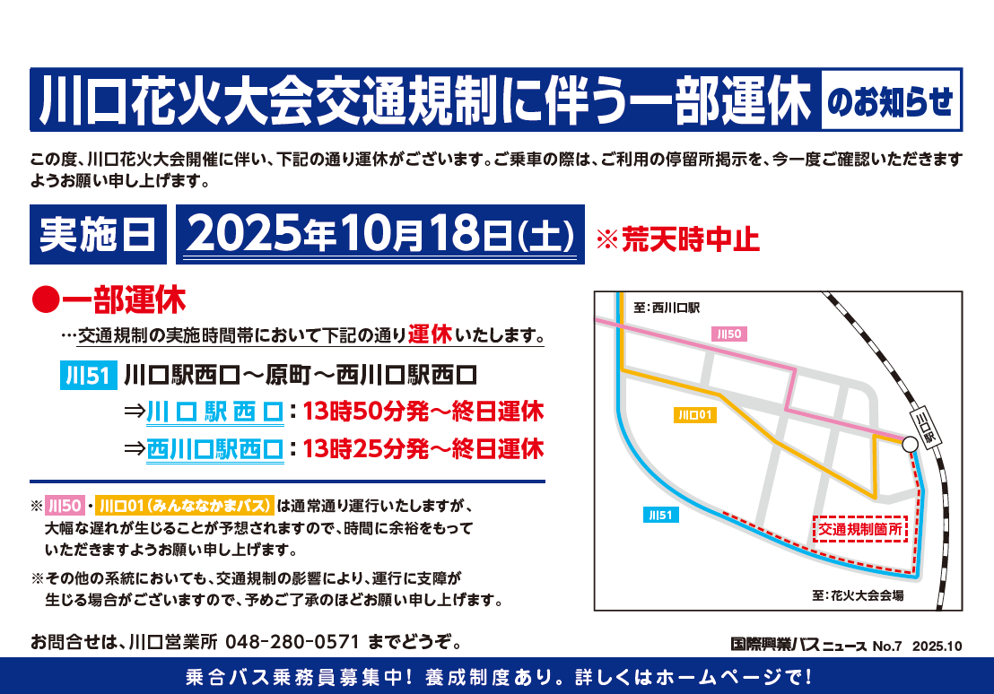 いつも国際興業バスをご利用いただきましてありがとうございます。2025年10月18日(土)、「川口花火大会」(荒川運動公園グラウンド・土手沿い斜面)の開催に伴い、会場周辺での交通規制が実施されるため一部路線を運休といたします。※雨天決行(荒天中止)