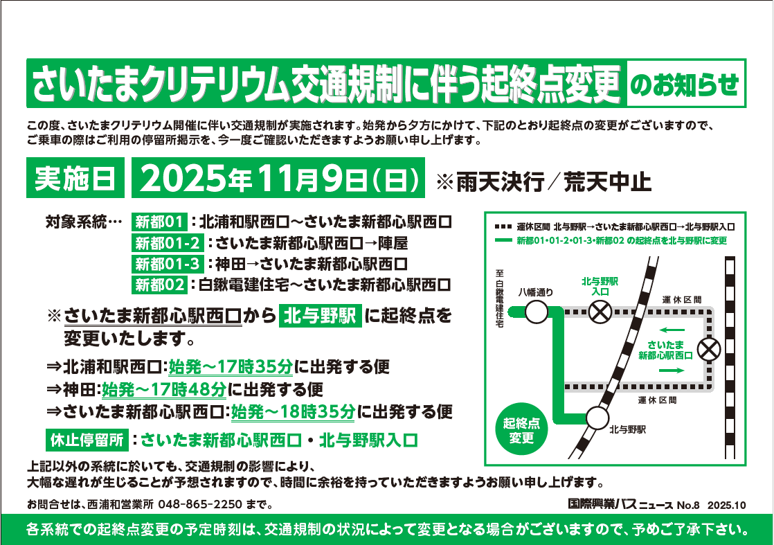 いつも国際興業バスをご利用いただきましてありがとうございます。さいたまクリテリウム開催に伴う交通規制により、下記のとおり起終点の変更・迂回運行を実施いたします。