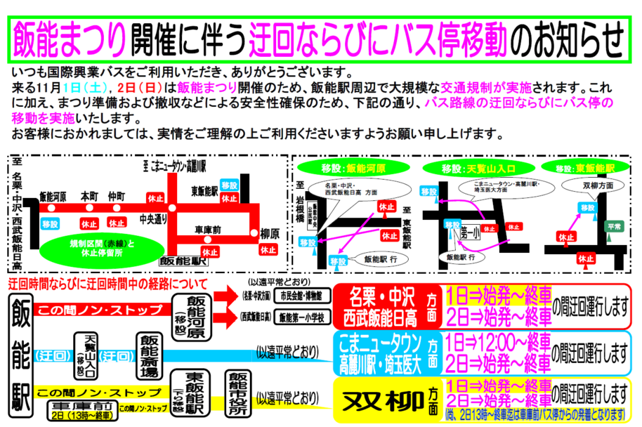 いつも国際興業バスをご利用頂きまして誠にありがとうございます。11月1日(土)および2日(日)、"飯能まつり"開催に伴い、下記のとおり迂回・停留所の休止・移設を実施いたします。