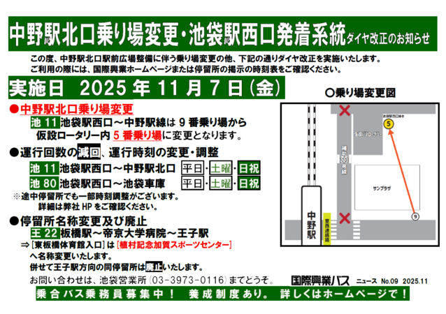 11/7(金)中野駅北口乗り場変更・池袋駅西口発着系統ダイヤ改正・停留所名変更及び廃止のお知らせ