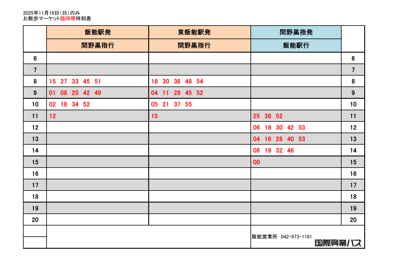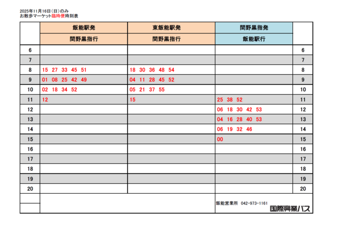 バスに関するお問合せは、国際興業バス 飯能営業所 TEL 042-973-1161 までどうぞ。