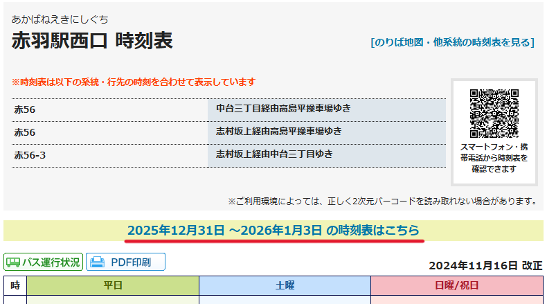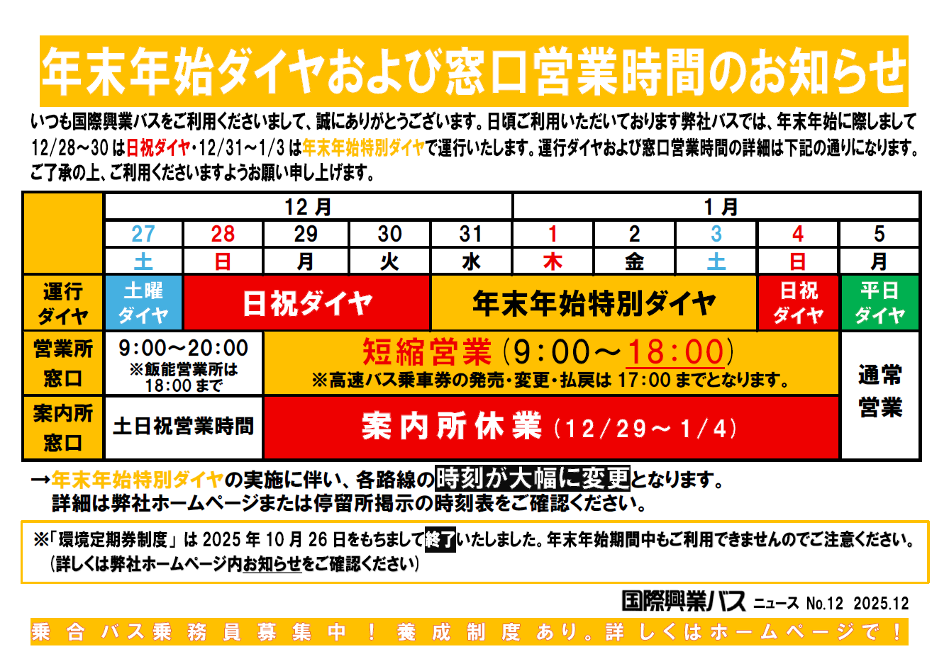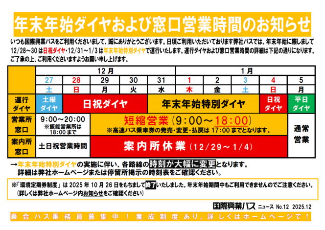 弊社バスでは年末年始に際しまして、12/28~30は日祝ダイヤ・12/31~1/3は年末年始特別ダイヤで運行いたします。運行ダイヤの詳細は下記の通りになります。ご了承の上、ご利用くださいますようお願い申し上げます。