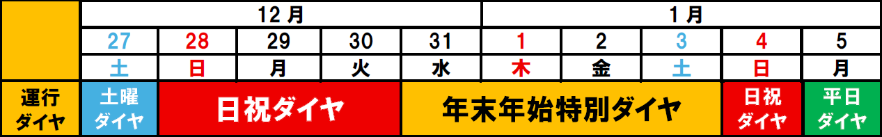 ※年末年始特別ダイヤは、通常の日祝ダイヤなどと比べ、始発時刻の繰り下げ・終車時刻の繰り上げが行われます。