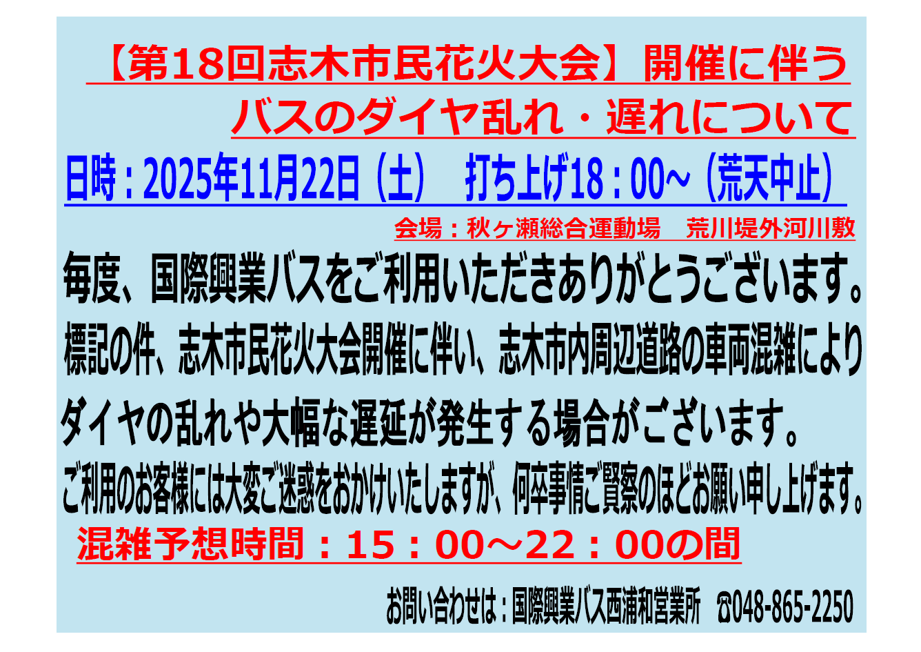 11/22(土)の「志木市民花火大会」開催に伴い、志木市内周辺道路の混雑によりバスの運行に遅延が生じる可能性がございます。ご利用のお客様にはご迷惑をおかけいたしますが、あらかじめご了承の上、ご利用くださいますようお願い申し上げます。