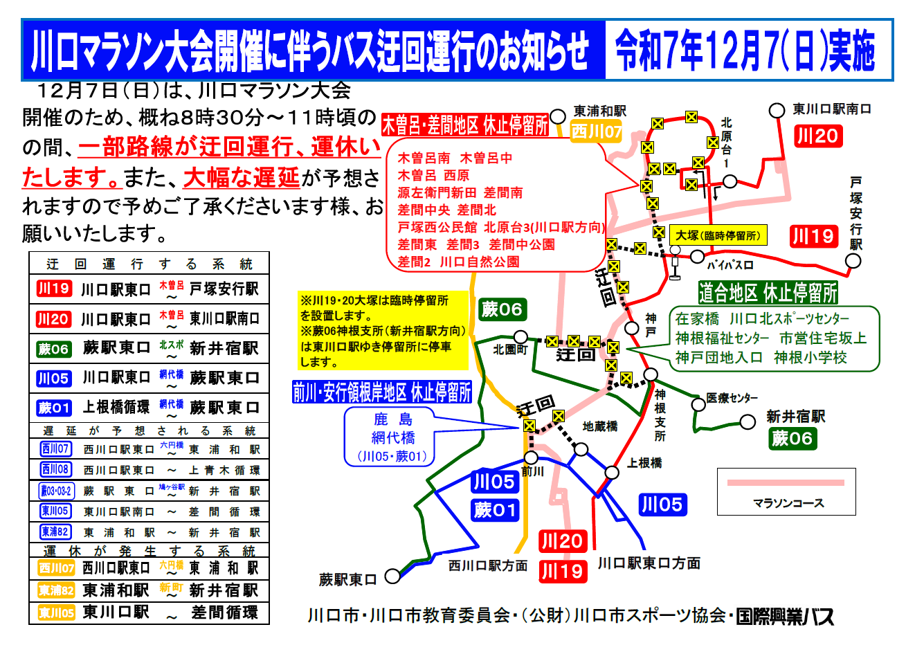 【迂回・運休】12/7(日)「川口マラソン大会」開催に伴う運休・迂回運行のお知らせ